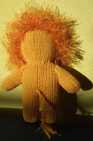 Von hinten sieht man die Mittelnaht und das Schwänzchen. Leo ist nämlich flach gestrickt und dann zusammengenäht.