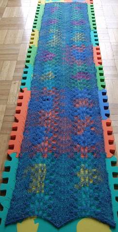 | Schal für Tine aus knapp 20g Lace (100% reine Schurwolle, Corrediale) von Handpaintedyarn, Farbe "Blue Sea". Etwa 115cm x 20cm -- ein Hauch von Nichts... 16.3.2008 080316-tines-schal-gespannt.jpg |