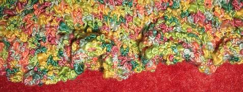 | Die untere Kante hat eine leichte Rüschenkante bekommen: 1 Reihe aus jeder 2. Masche 2re M gestrickt, dann eine R rechts, dann 1 R li und dabei aus jeder 2. M 2 reM gestrickt, noch eine R rechts und schließlich mit dicken Nadeln abgekettet. 080618_kleidchen-hannah_rueschenkante.jpg |