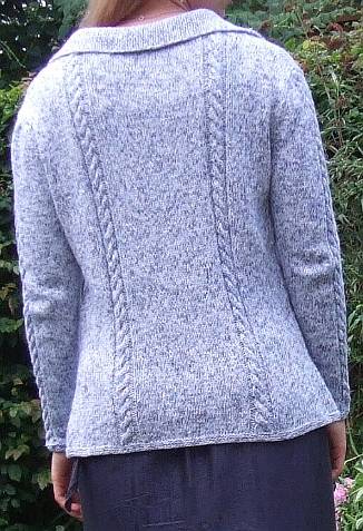 | Die Zöpfe wiederholen sich im Rücken und auf den Ärmeln. Man sieht hier, dass das Gestrick in der Weite im Schulterbereich sehr nachgibt (die Maschenzahl zwischen den Zöpfen ist überall gleich!). 080801-strickjacke-caro-hinten.jpg |